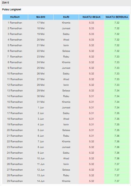 Berikut dikongsikan jadual waktu berbuka puasa dan imsak Kedah mengikut zon termasuk memaparkan tarikh hijrah hari waktu imsak dan berbuka. Untuk Ramadhan 1440H 2019M tarikh bermulanya puasa yang dikeluarkan oleh JAKIM telah ditetapkan bermula pada hari Isnin 6 Mei 2019 1 Ramadhan 1440 H. Malaysia 21 Jun 2022 - Se Waktu solat.